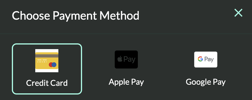 Choose whether you want to use Credit Card, Apple Pay, or Google Pay.